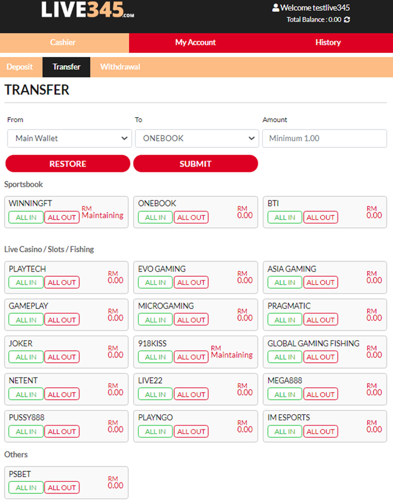 2. RESTORE button is to auto transfer all credit from all games to your MAIN WALLET.
